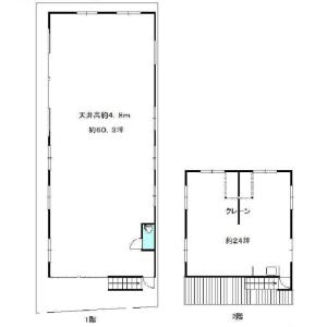 ☆クレーン付きです。(残置)天井高4.8m 一部2階建て 1階 約60.30坪 2階 約24坪
