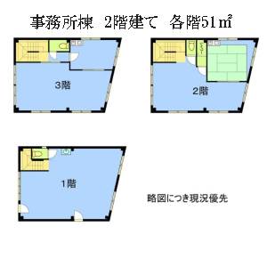 倉庫棟2階建1階のみ賃貸126.78㎡・3階建事務所棟 各階51.92㎡延155.76㎡ 〇3階建事務所棟 各階51.92㎡ 延155.76㎡47.11坪 〇倉庫棟(2階建1階のみ賃貸) 126.78㎡(38.35坪